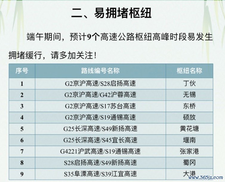 江苏省交通运输厅“智慧交通平台”预计,端午期间,全省国省道省界通道日均流量为170.0万辆,其中高速公路省界通道日均流量为101.0万辆,普通国省道省界通道日均流量为69.0万辆。周边相邻的四省市中,预计苏皖省界日均流量最大,为62.5万辆。6月2日端午小长假第三天,预计全省有11个国省道路段高峰时段易发生拥堵缓行,其中高速公路路段10个、普通国省道路段1个;预计9个高速公路枢纽高峰时段易发生拥堵缓行,提醒出行市民注意避峰,安全出行。